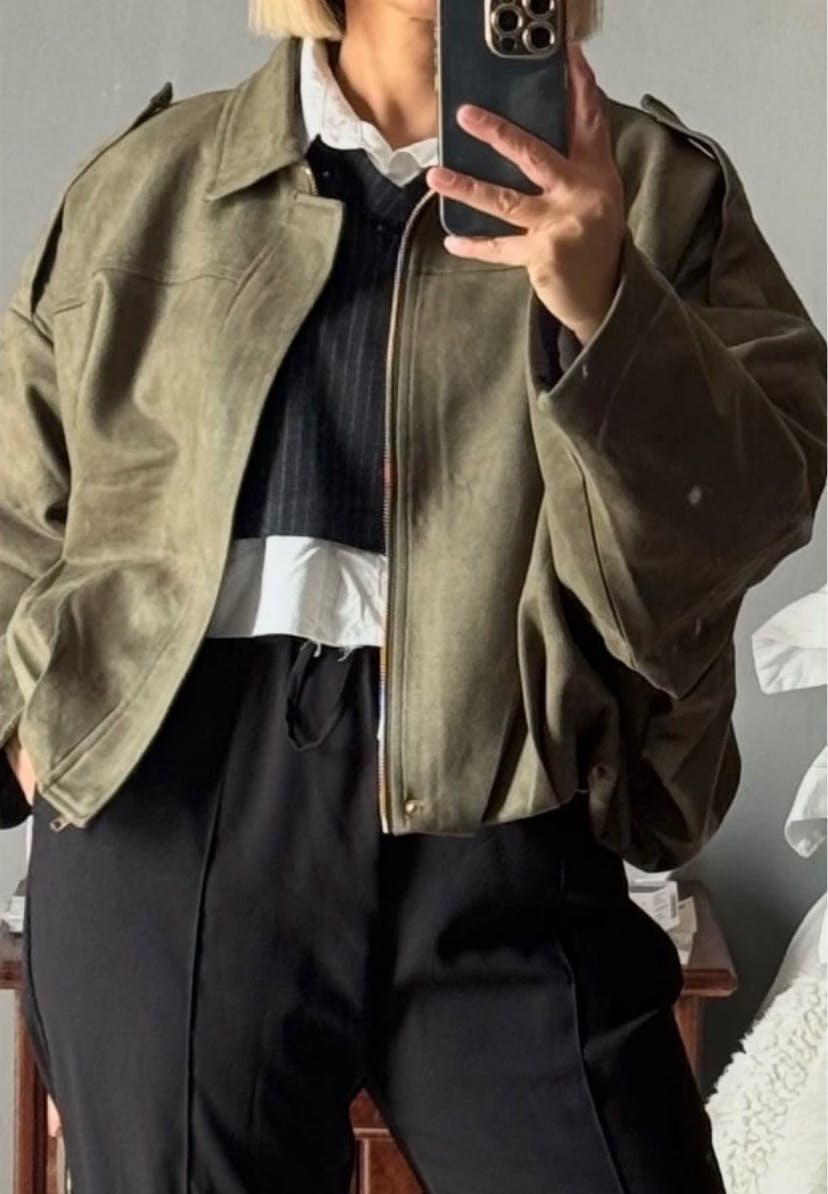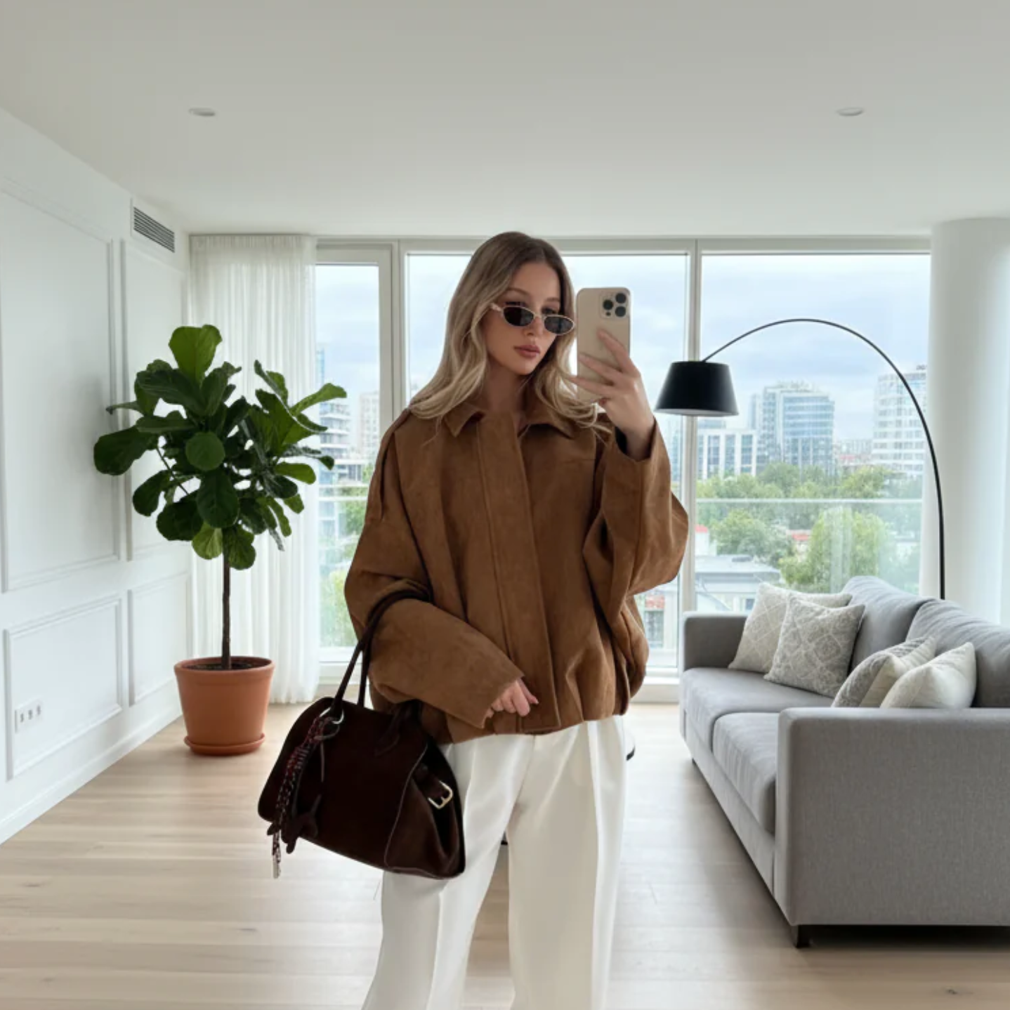La coupe est volontairement oversize pour un rendu tendance et structuré. Si vous souhaitez un effet ample et moderne, prenez votre taille habituelle. Pour un rendu plus ajusté, une taille en dessous conviendra parfaitement.